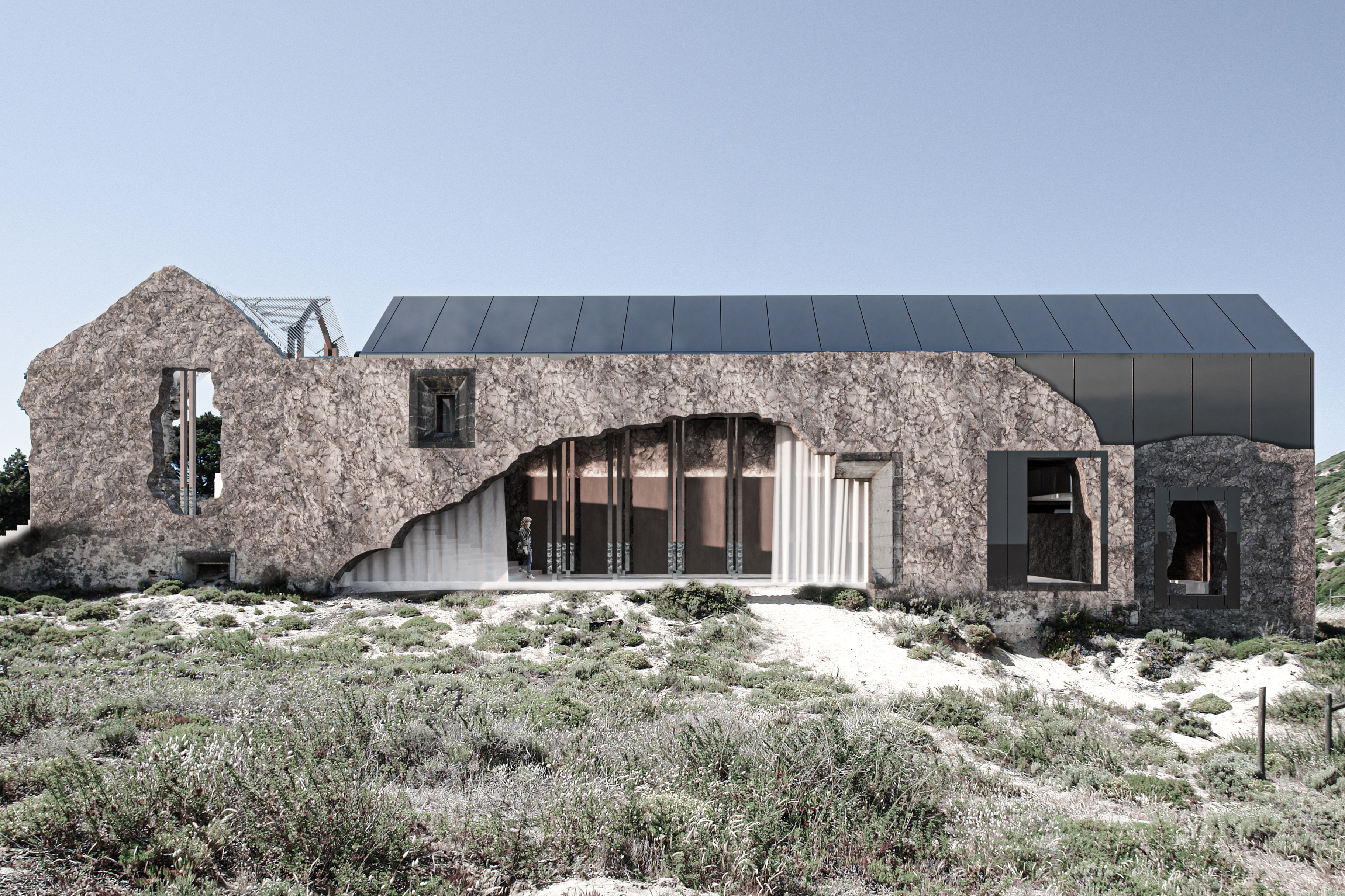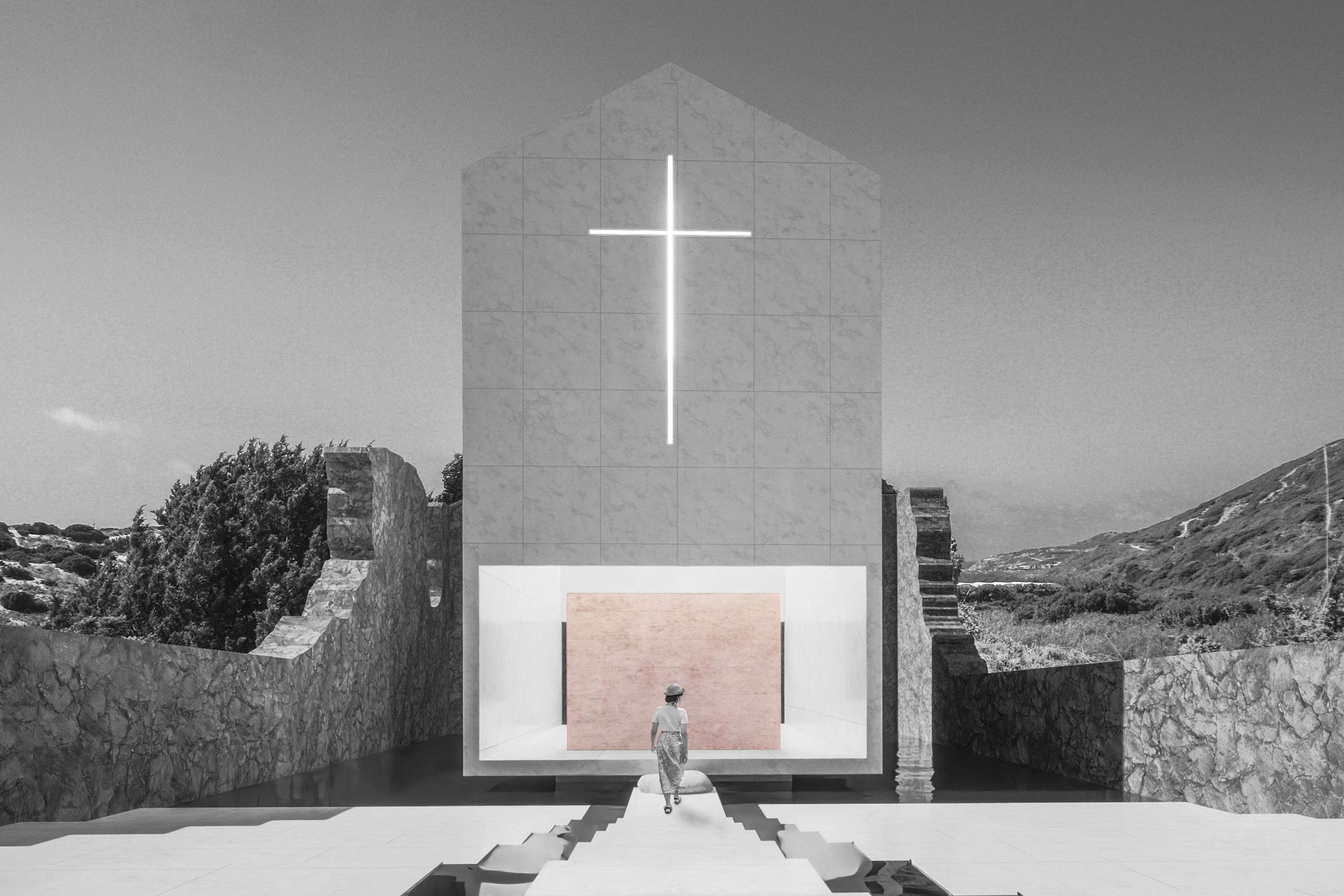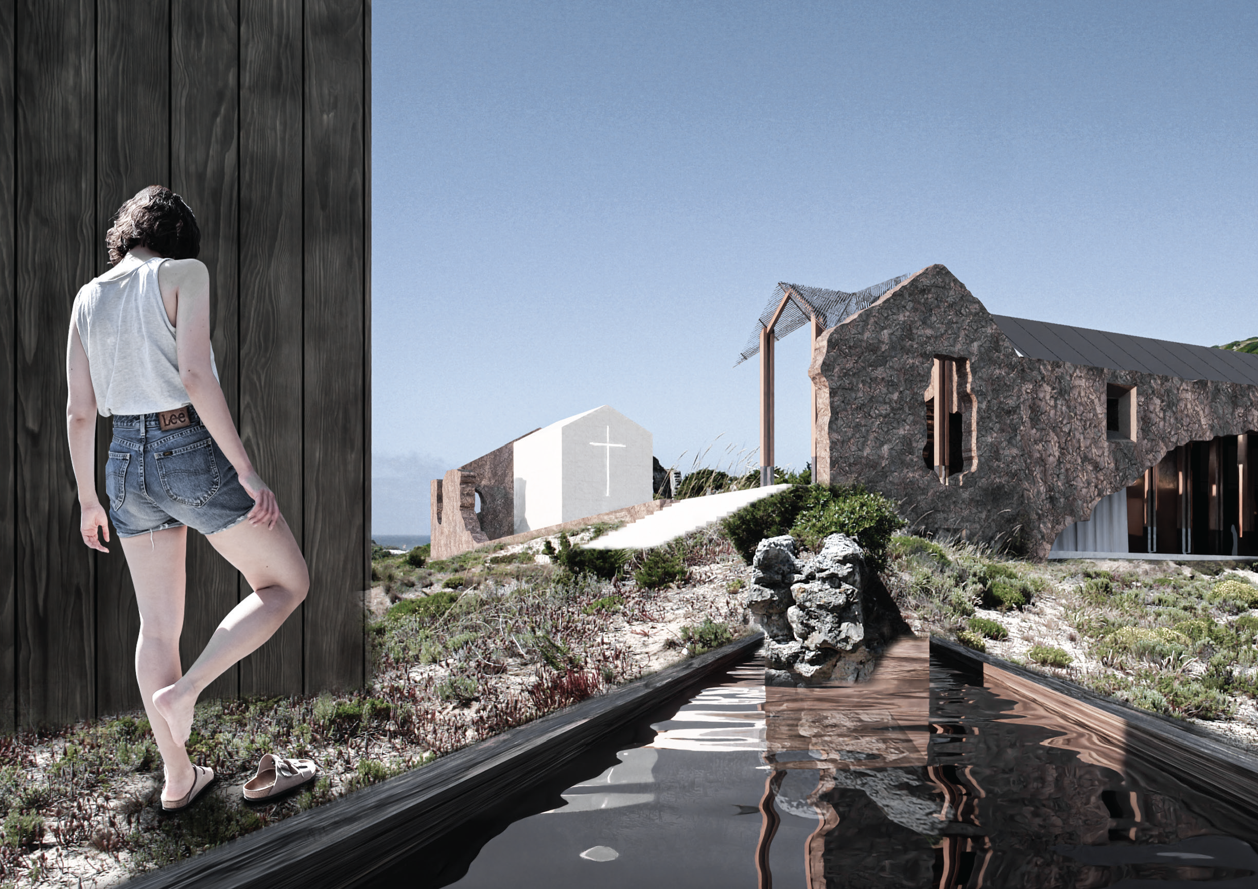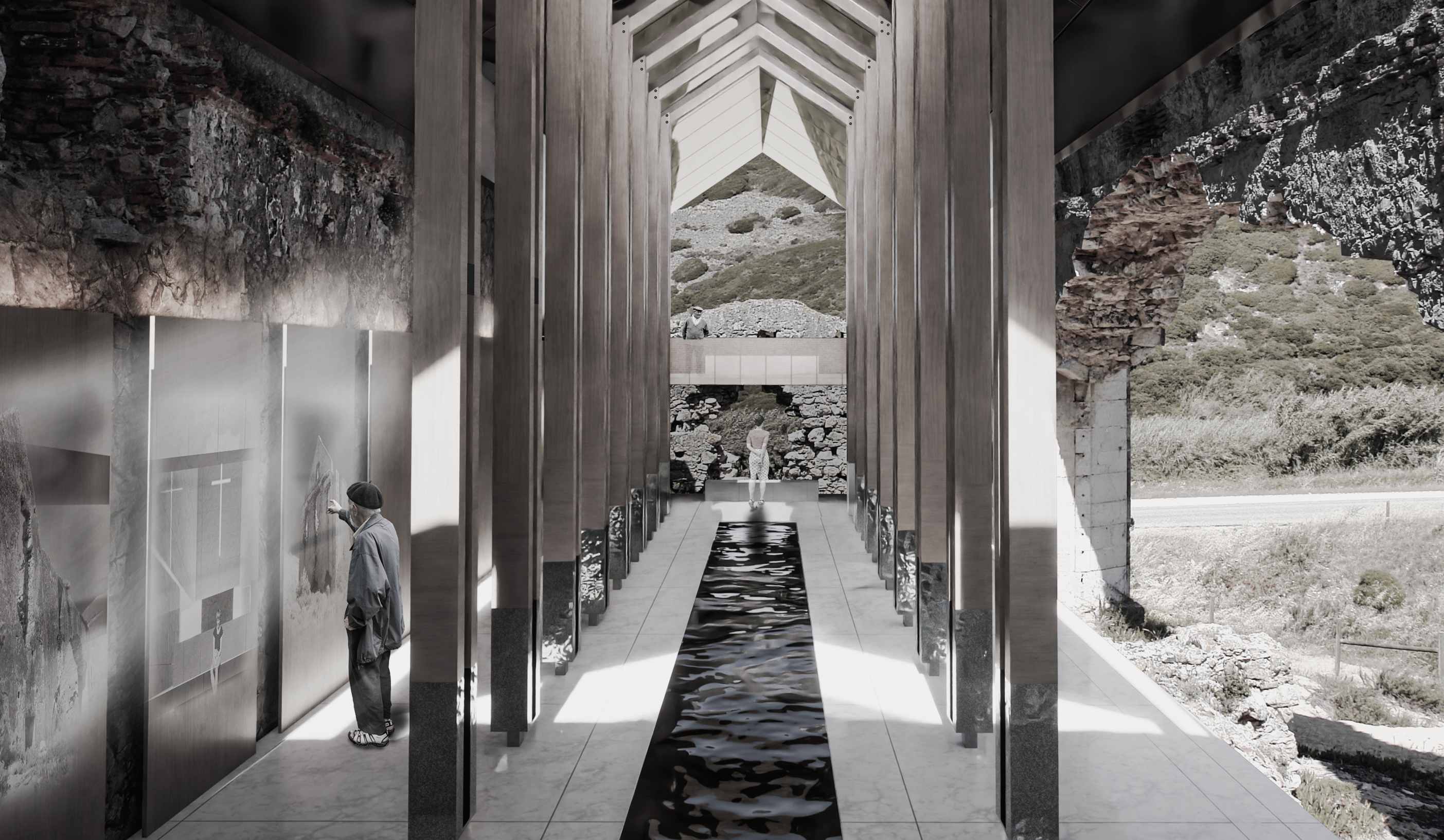 The concept for Binomial stems from an idea to create a calm space nested within the ancient ruins of the Convento de Penafirme while being entirely exposed to the natural environment. Thus, majority of the elements located within the ruins are perforated at locations which match original openings. Allowing users to experience the elements such as wind while being inside the built structure, creating a middle ground between the artificial and the natural, a symbolic balance. The memory and prayer chambers are both fronted by transitional spaces with the presence of water, a reflective and purifying element used as a physical and spiritual connection for all functions in the concept. The prayer chamber, or “inner space” is protected from the elements to a higher degree than the rest of the concept. This room presents a Pink Portuguese marble wall at its entrance and holds a religious element within its architecture as an expression of the Convento de Penafirme’s historical identity. Concept developed in collaboration with MNDA Studio and Chiara Morelli. Works Presented: Individual.