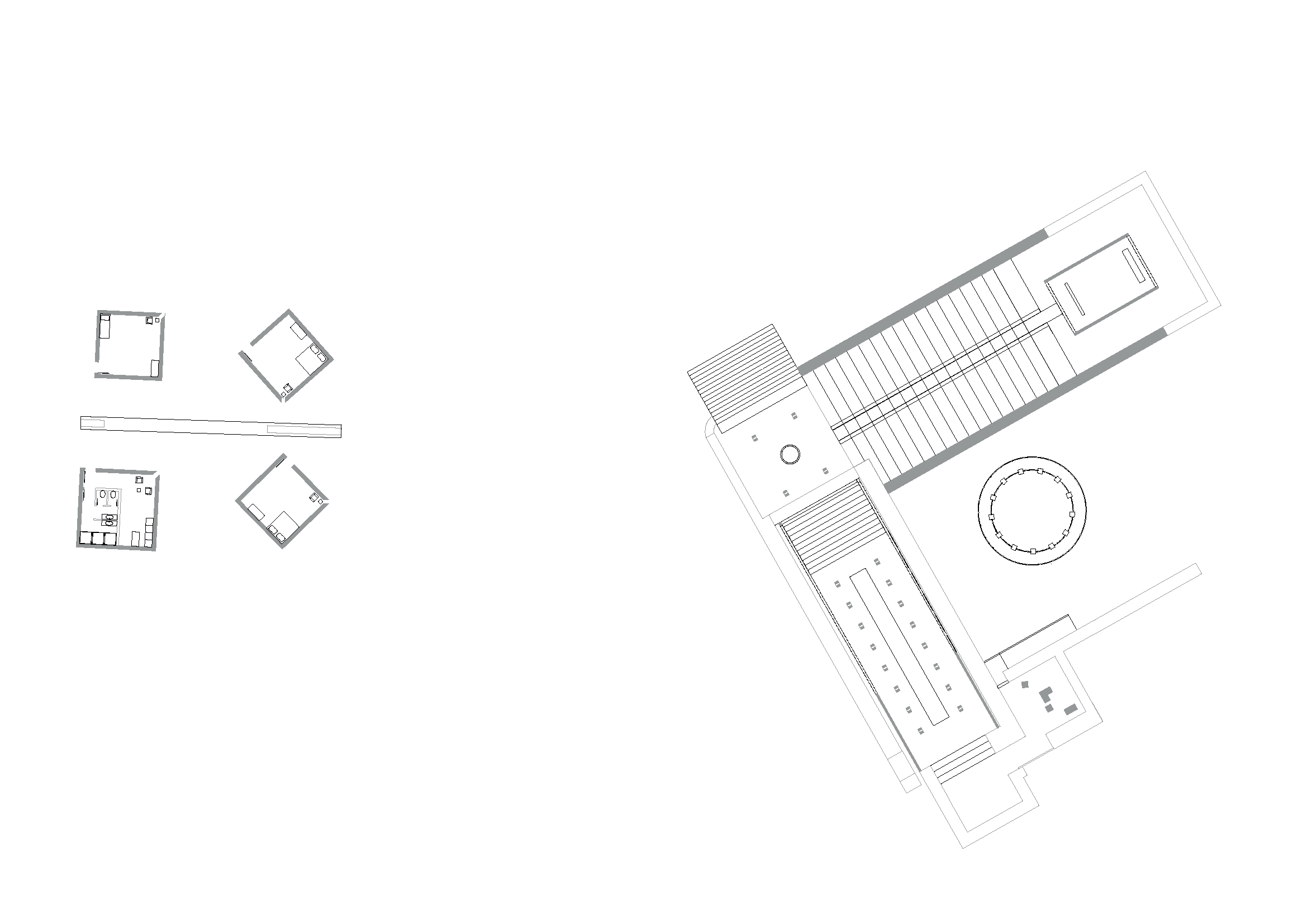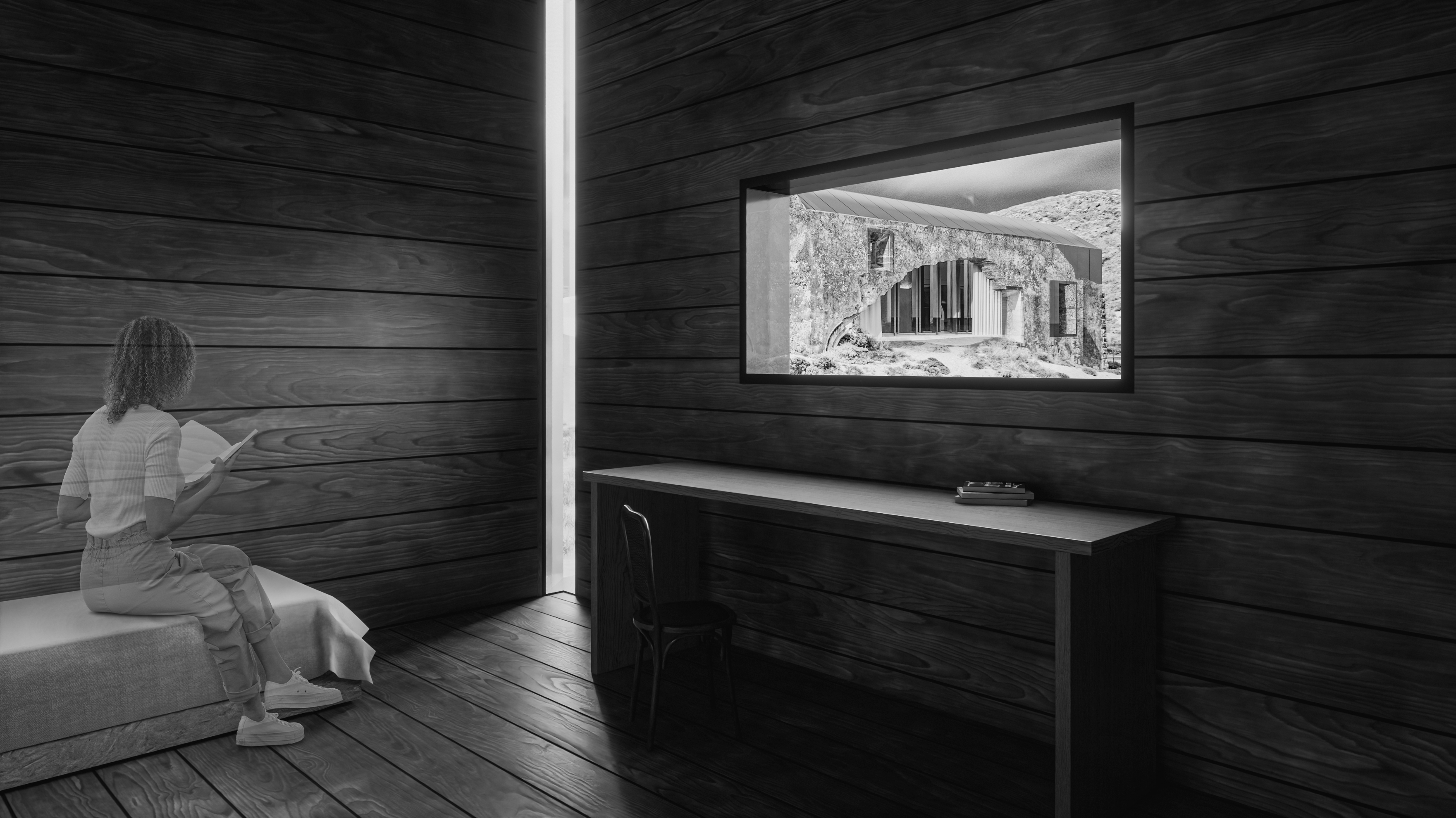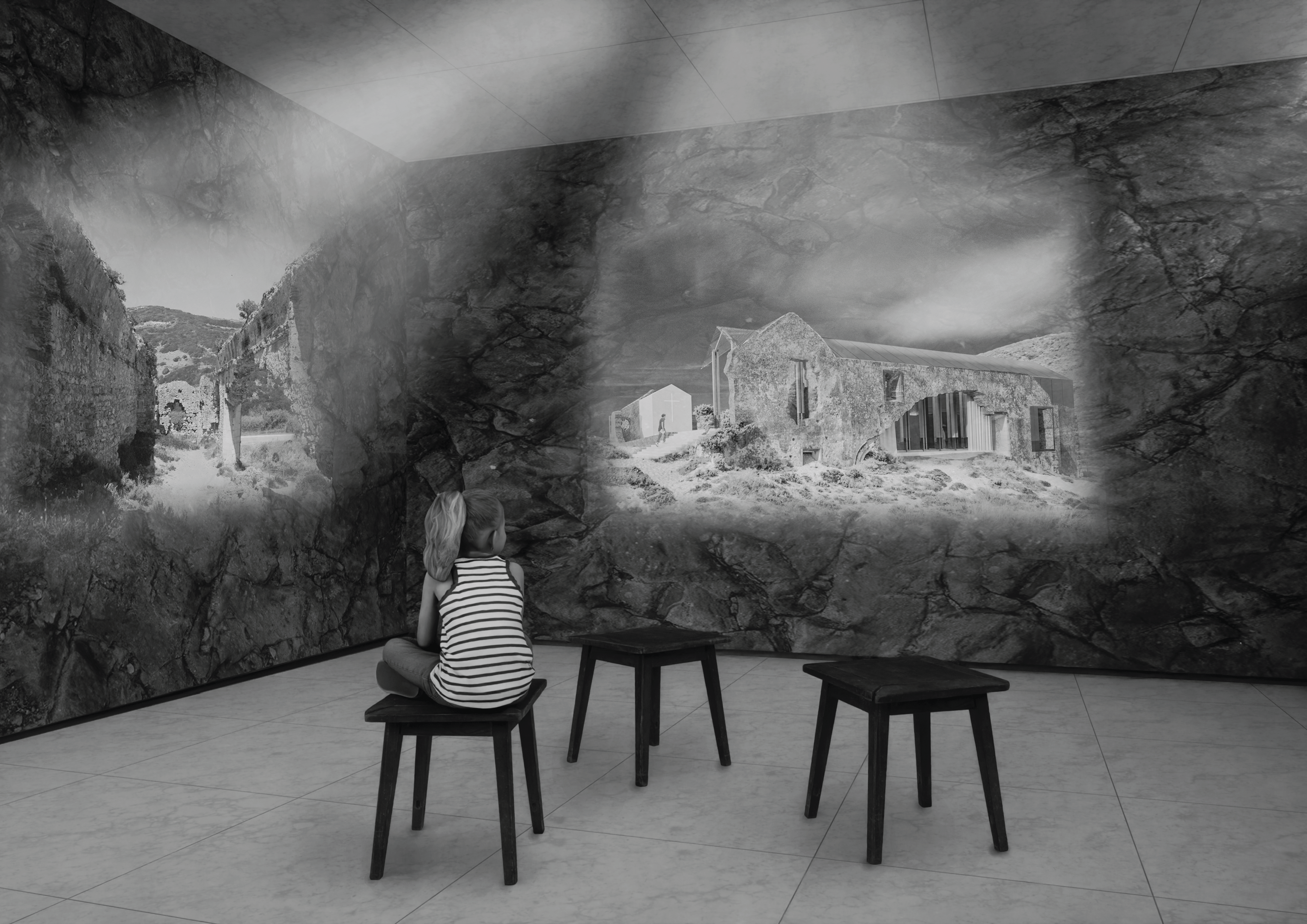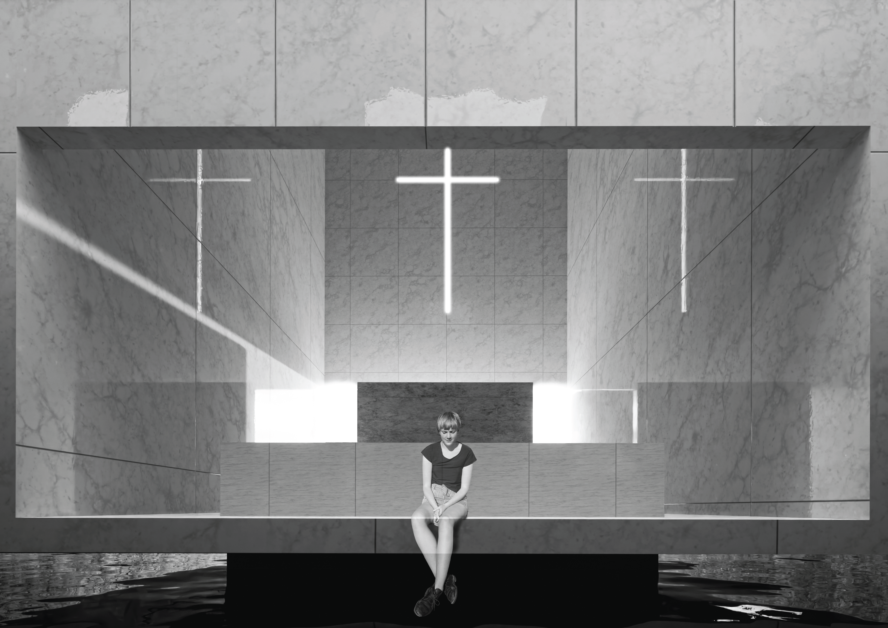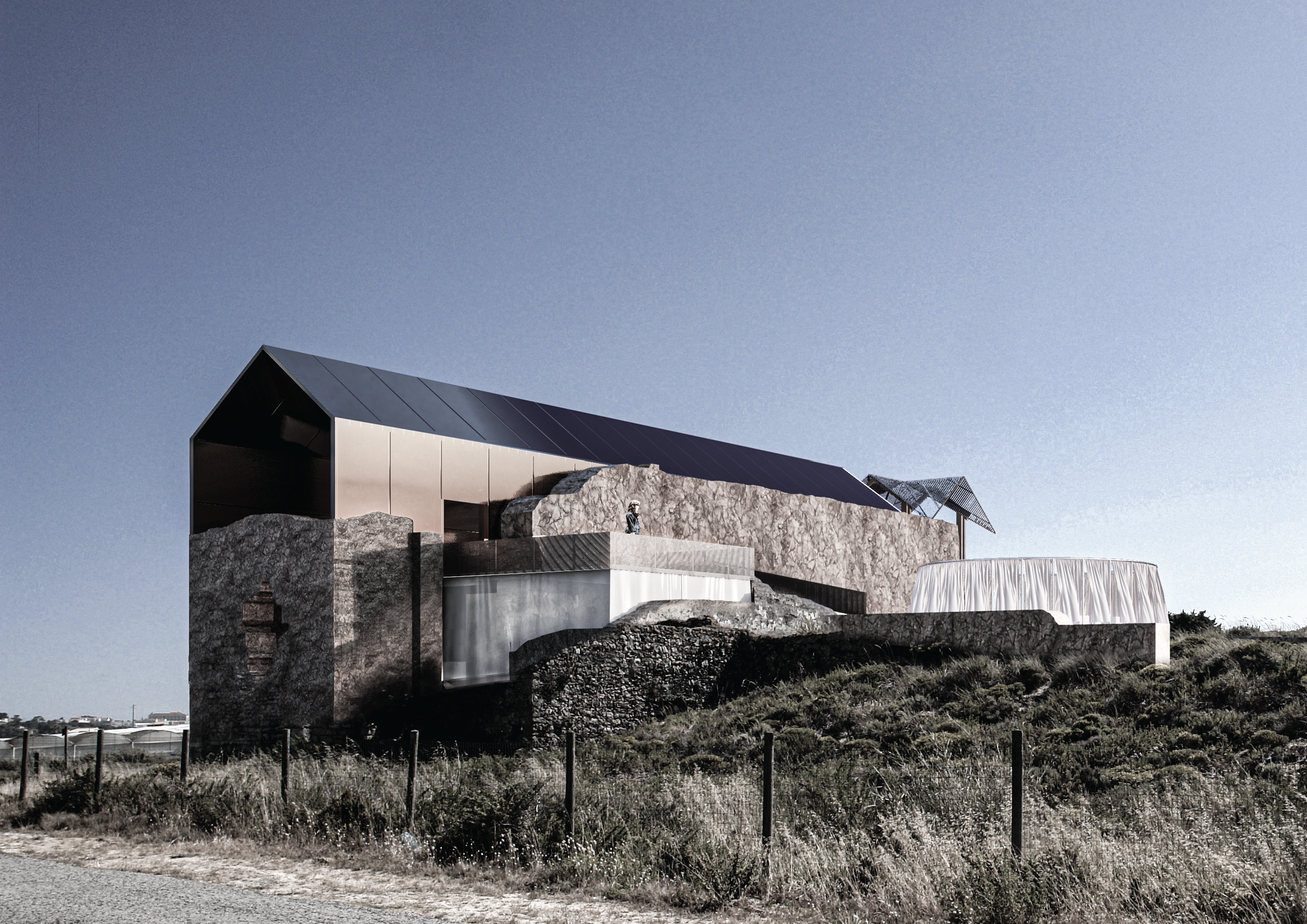 The concept for Binomial stems from an idea to create a calm space nested within the ancient ruins of the Convento de Penafirme while being entirely exposed to the natural environment. Thus, majority of the elements located within the ruins are perforated at locations which match original openings. Allowing users to experience the elements such as wind while being inside the built structure, creating a middle ground between the artificial and the natural, a symbolic balance. The memory and prayer chambers are both fronted by transitional spaces with the presence of water, a reflective and purifying element used as a physical and spiritual connection for all functions in the concept. The prayer chamber, or “inner space” is protected from the elements to a higher degree than the rest of the concept. This room presents a Pink Portuguese marble wall at its entrance and holds a religious element within its architecture as an expression of the Convento de Penafirme’s historical identity. Concept developed in collaboration with MNDA Studio and Chiara Morelli. Works Presented: Individual.