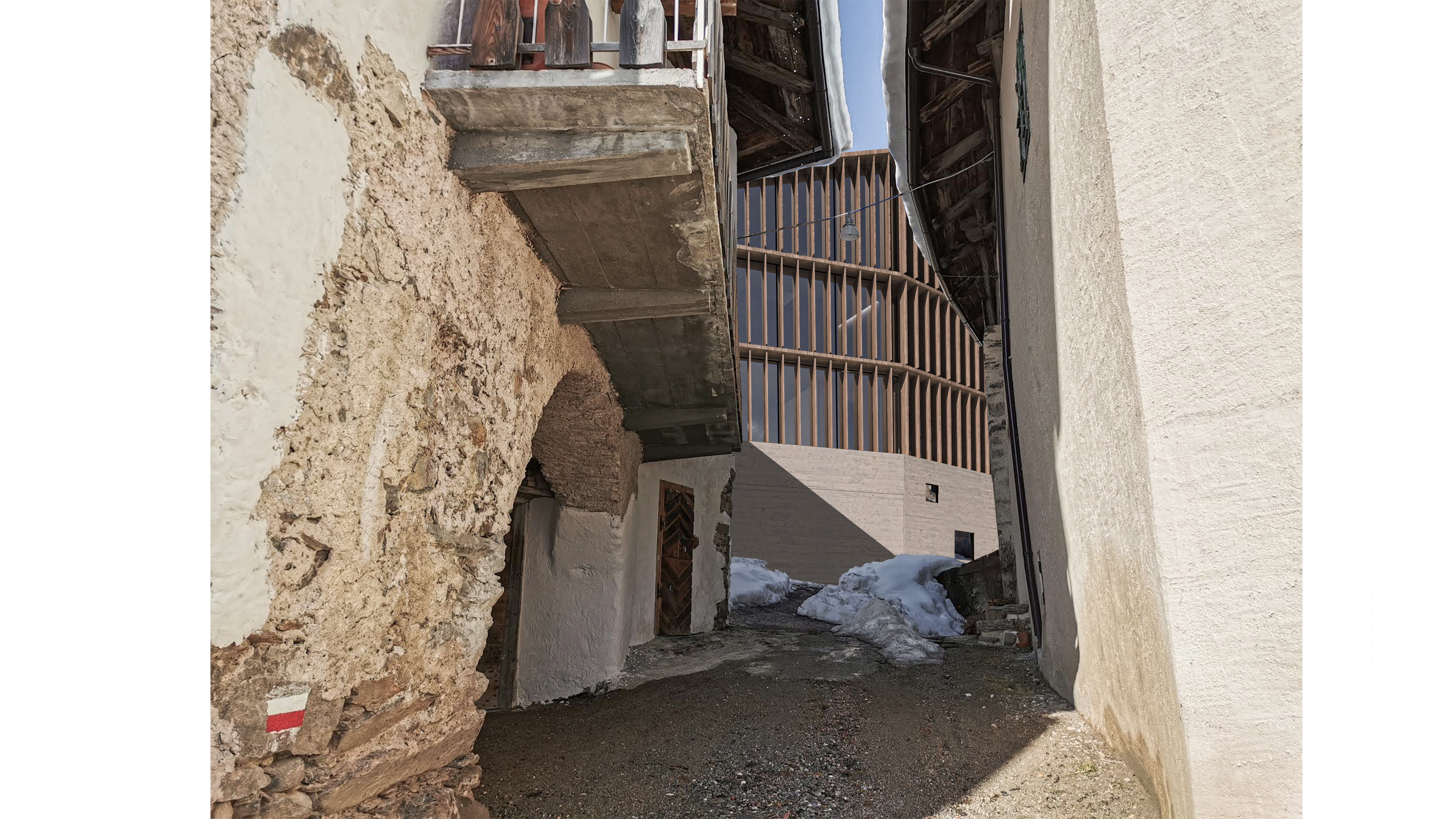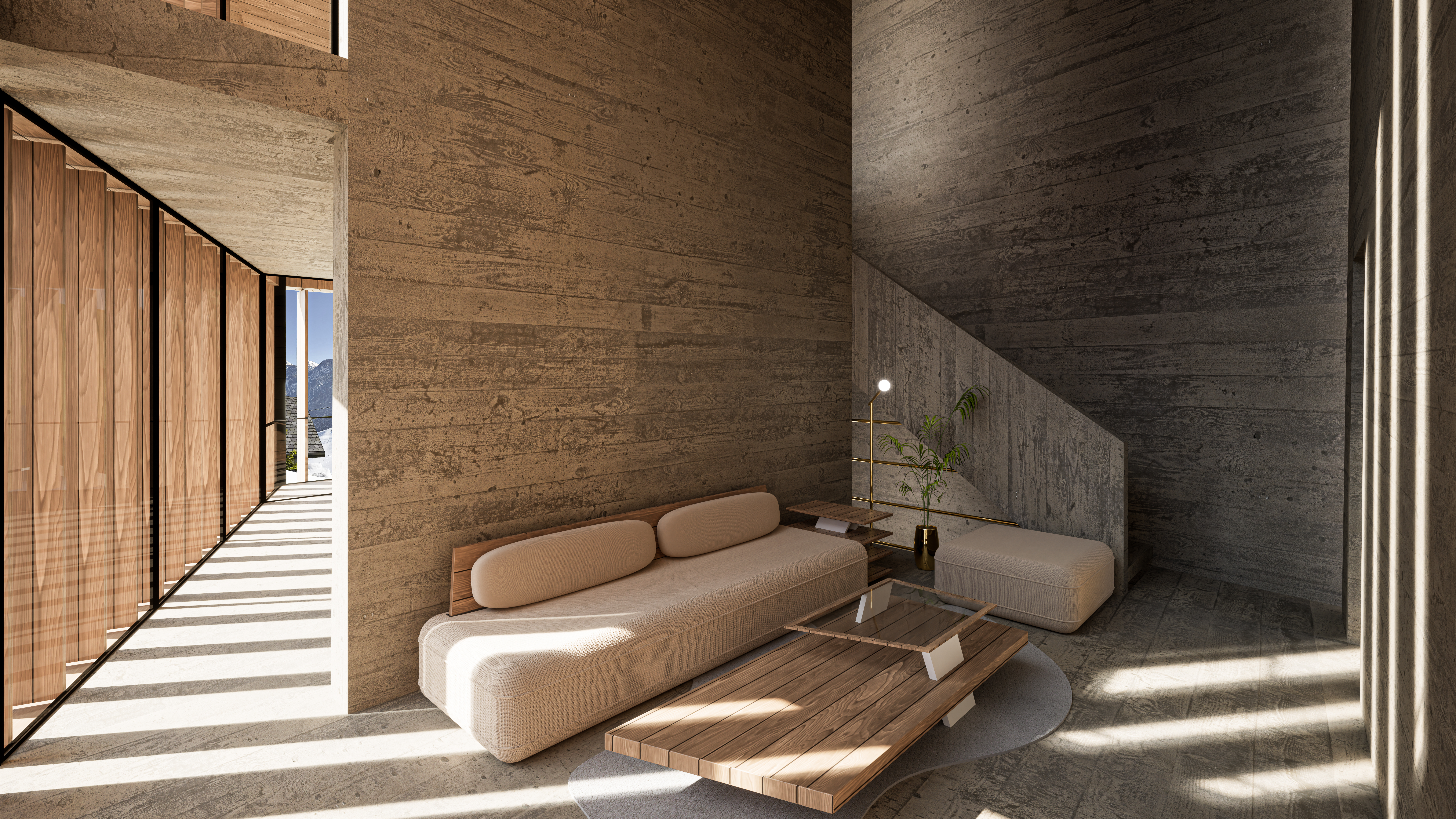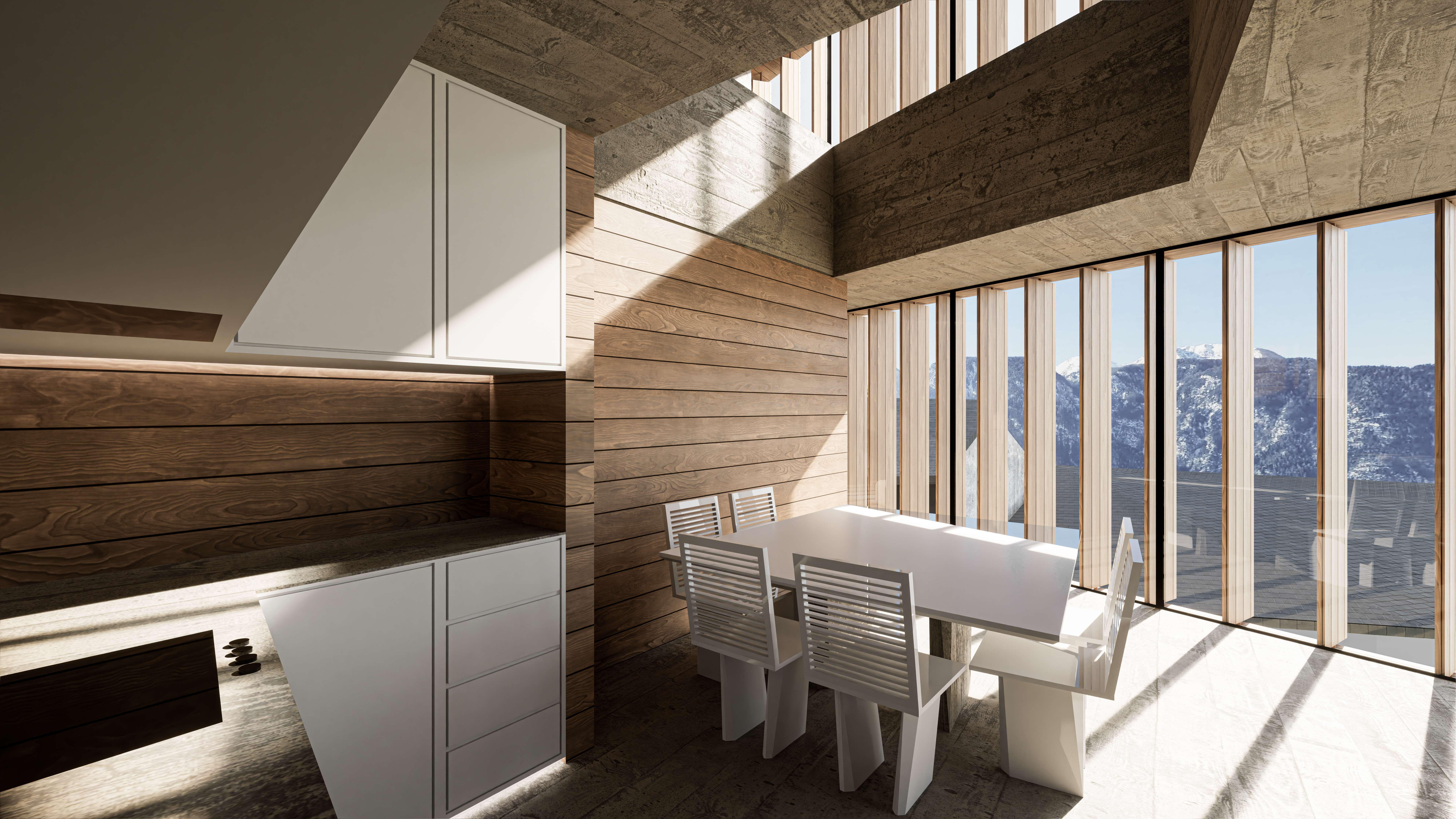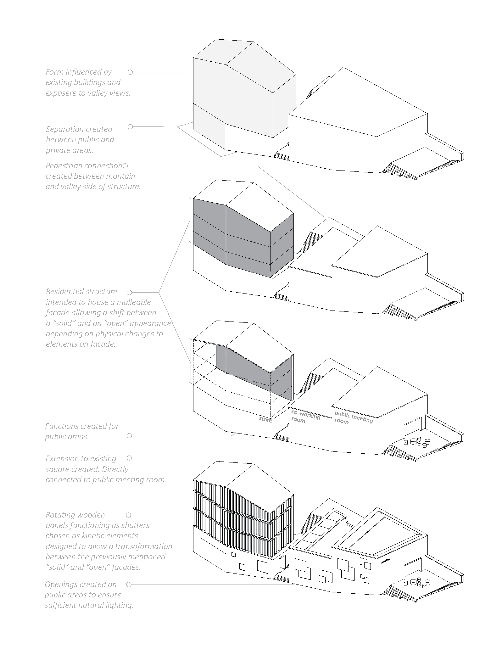 32 Montes is a project located in a tiny village in Trentino, Italy. The project is composed of both a house and a public space. The house holds three bedrooms and two bathrooms and is spread through three floors. The public areas hold a vegetable garden, a public meeting room, a small store and a coworking space. The structure and materials for this project have been influenced by the vernacular architecture located within the town. Being a mountain village, Montes has a very small population. As a result, the aim of this project is to invite new residents to populate it and become more attractive to people currently living in cities. Thus preventing the possibility of Montes becoming a ghost town. In order to maximize the value which a user might place on a house in this location, another influence for the design choice has been the connection between the interior of the house and the exterior views of the mountains. The concept of the visible and invisible has been explored in this project both through the outer shell composed of rotating panels and the interior composition of the house. The outer panels are 2.7 meters tall and 40 cm wide and electrically rotate based on user’s needs through a central control panel. These can be programmed to open and close at specific times of the day. When closed, the structure appears entirely solid. When open, the structrure becomes “see through”, creating a hybrid strucutre. Invisible doors have been used throughout the house to appear as walls.